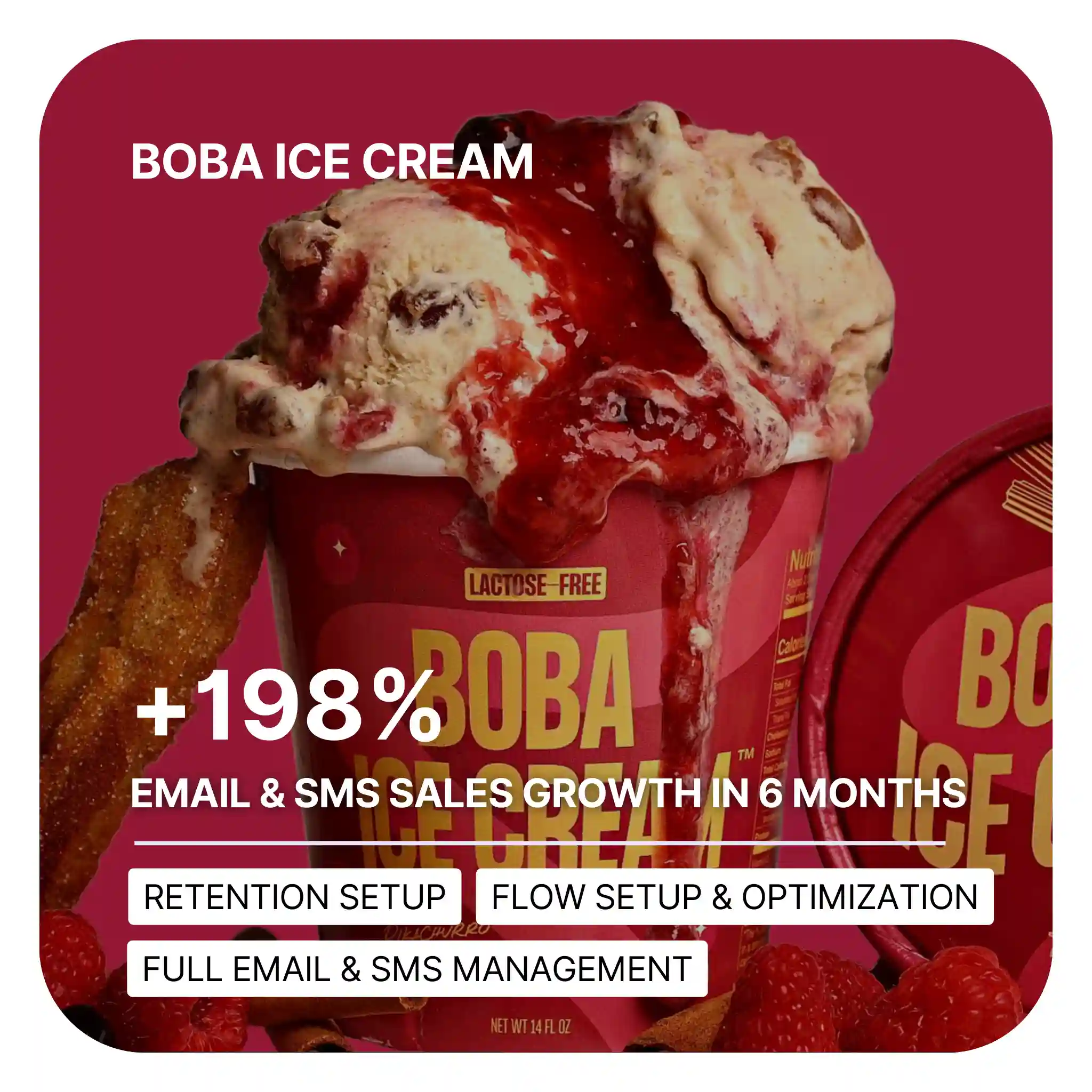 BOBA Ice Cream had a loyal fanbase, strong branding, and great products—but their retention strategy wasn’t keeping customers engaged after their first purchase. They partnered with us to revamp their email & SMS strategy, leading to a 198% increase in retention-driven revenue in just 6 months.